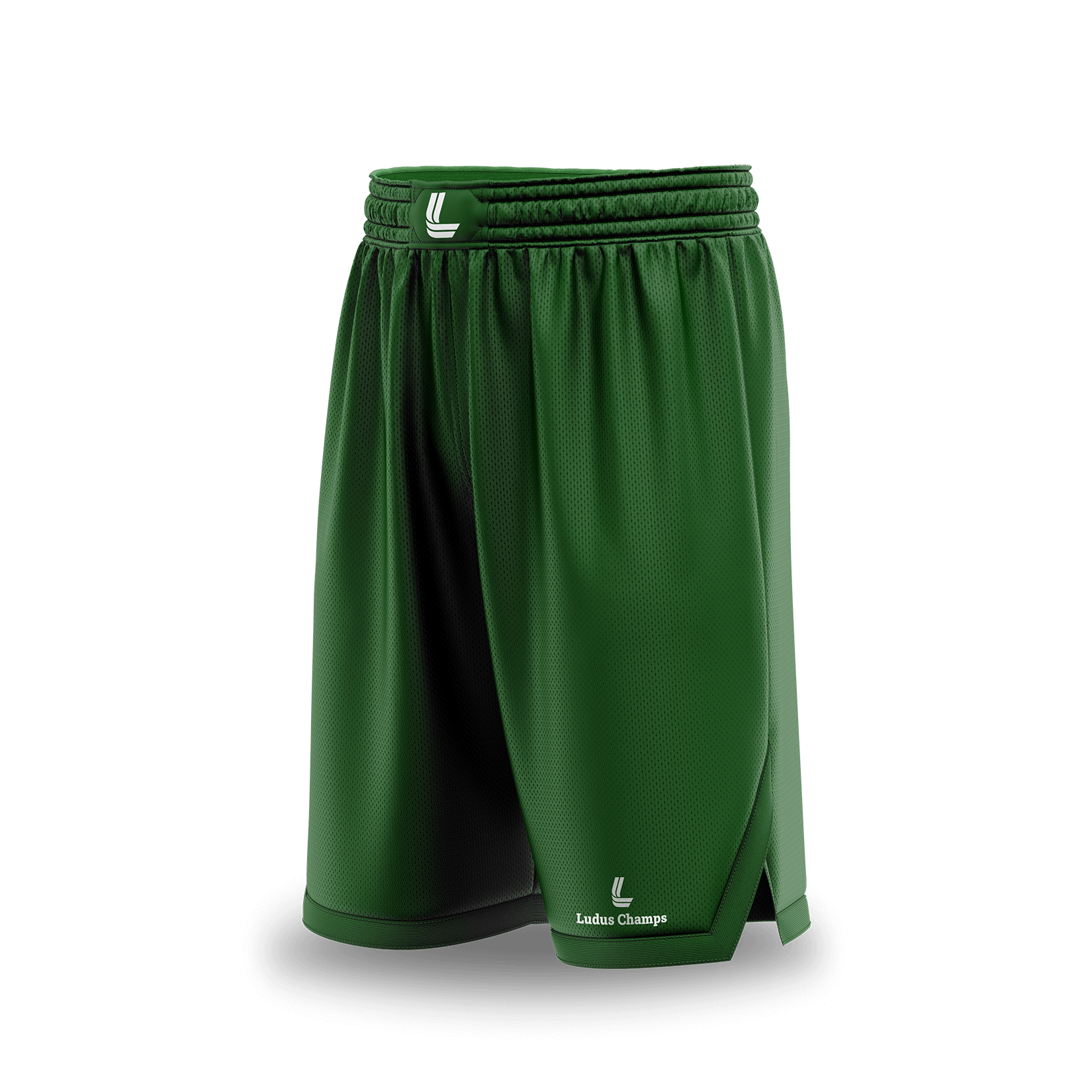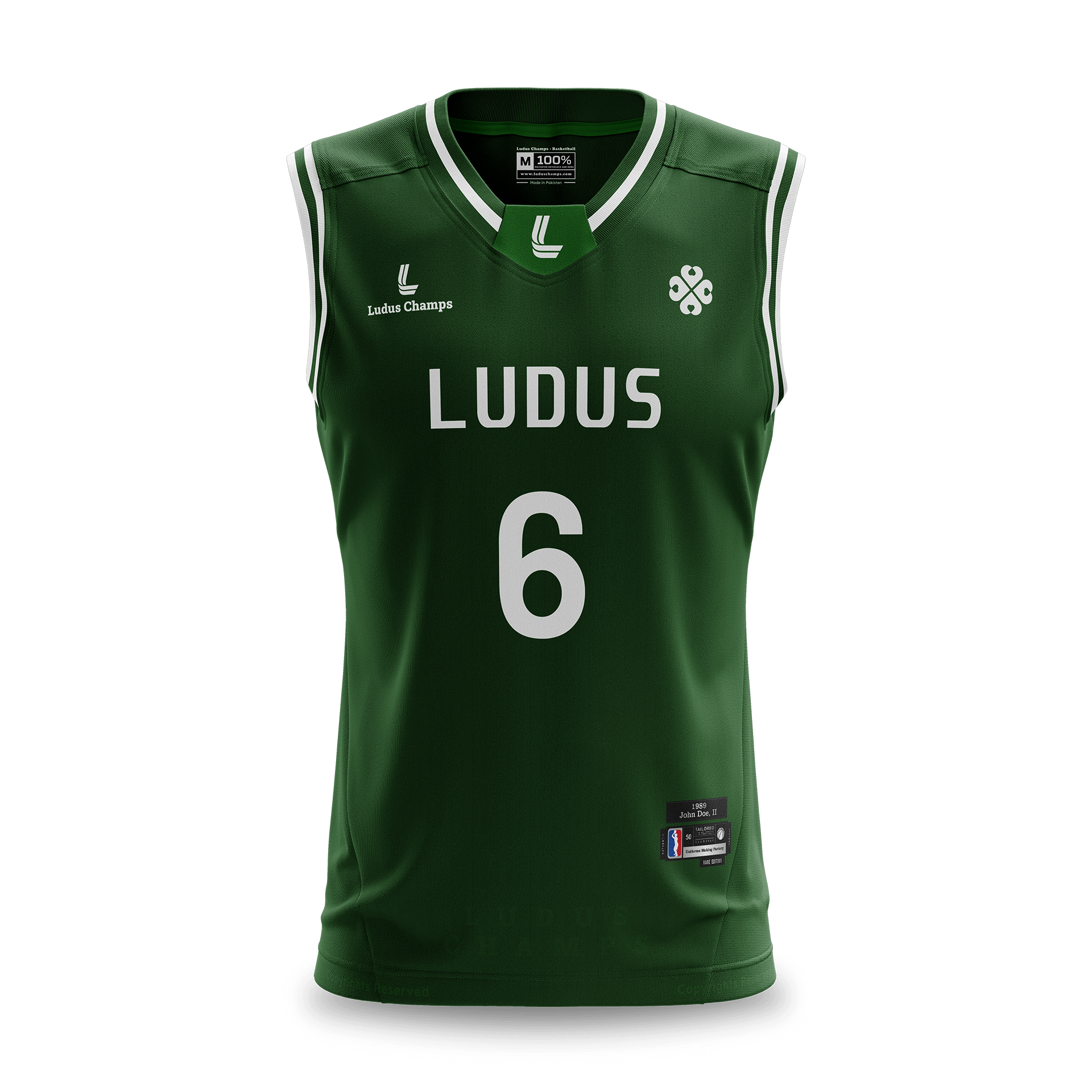 A sleeveless dark-green basketball jersey with a smooth, minimal look. The front features a slim white Ludus team name and a bold white number 6 across the torso. Two chest logos sit neatly between the neckline and arm openings — the left showing a leaf emblem and the right displaying the Ludus Champs brand mark. The V-neck collar uses a three-stripe rib (green-white-green), while the armhole ribs reverse the pattern with white-green-white contrast. At the lower left hem, dual woven patches add authenticity — one reading Rare Edition / Tailored / Uniform Making Factory / Authentic and another placeholder above it with 1989 John Dow, II, which can be customized for player names. All seams, stitches, and texture details are visibly defined, highlighting a factory-level finish and fully customizable build in size, color, and fabric.