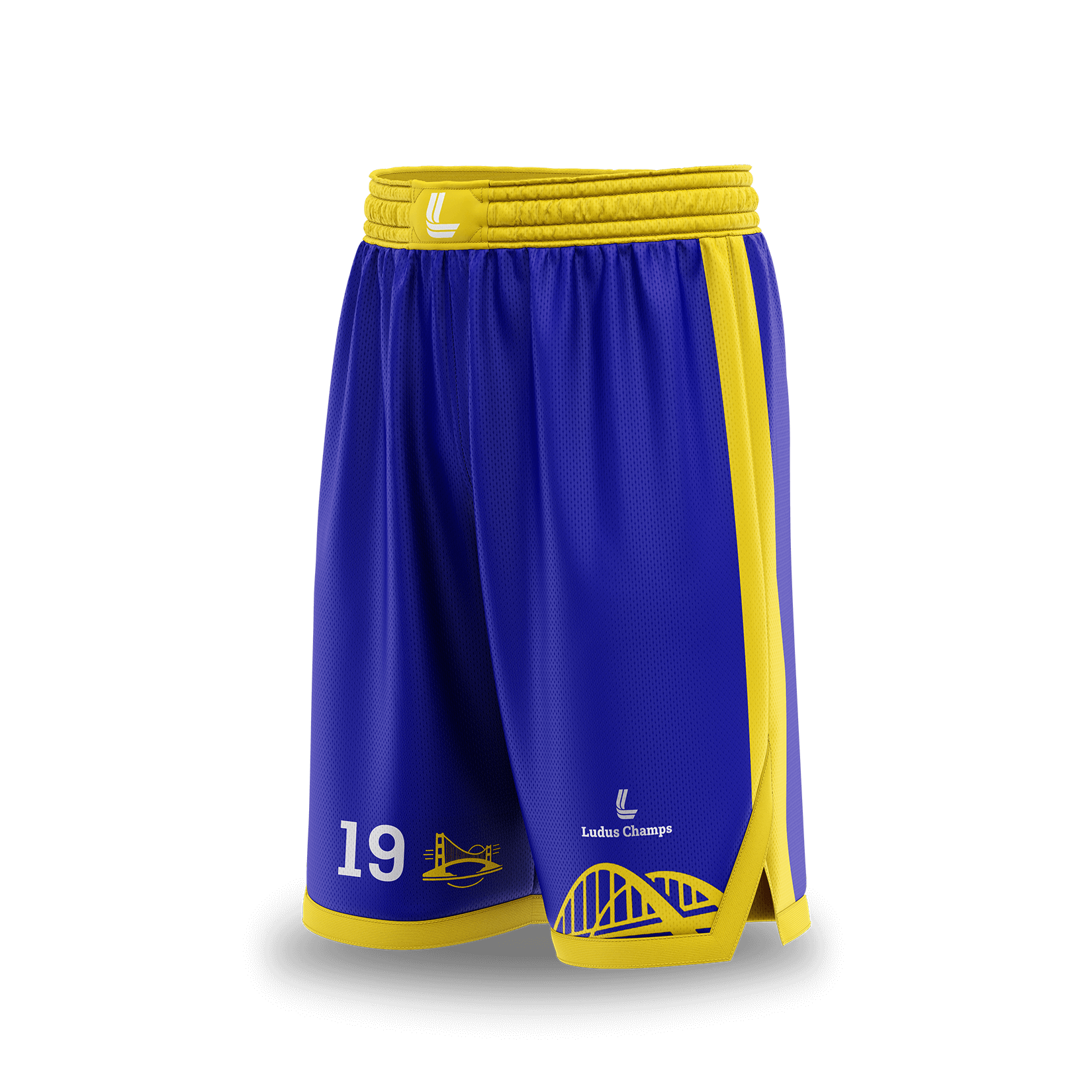 This sleeveless basketball jersey features a bold royal blue base paired with a bright yellow collar and cuffs for a clean, vibrant contrast. The center chest area proudly displays a large bridge logo, symbolizing strength and unity. Just above the logo, a medium-sized white number “19” stands out, while beneath it, a curved yellow text reading “All Warriors” arches gracefully downward. Above the number, the phrase “Ludus Champs” appears in curved upward yellow text, completing a balanced front layout.